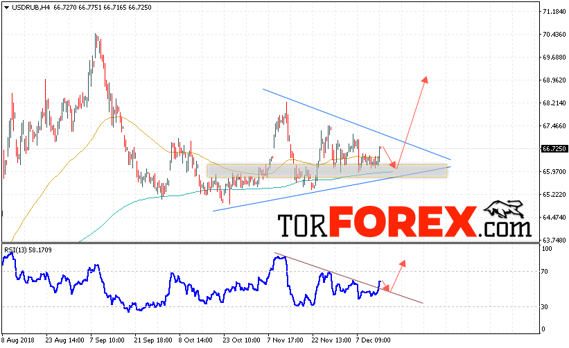 В пользу роста пары USD/RUB выступит тест линии тренда на индикаторе относительной силы. А также отскок от нижней границы модели «Треугольник». Отменой варианта роста пары USD/RUB на Форекс станет падение и пробой уровня 65.10 Рублей за Доллар. Это укажет на области поддержки и продолжение снижения пары Доллар Рубль в область ниже уровня 64.00. Подтверждением роста пары выступит пробой верхней границы модели «Треугольник» и закрытие выше уровня 67.35.