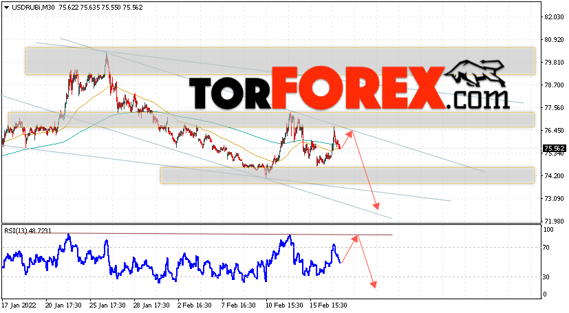 Дополнительным сигналом в пользу падения валютной пары USD/RUB 18 февраля 2022 выступит тест линии тренда на индикаторе относительной силы. Вторым сигналом станет отскок от верхней границы нисходящего канала. Отменой варианта падения пары USD/RUB на Форекс станет сильный рост котировок и пробой уровня 77.55 Рублей за Доллар. Это укажет на пробой области сопротивления и продолжение роста пары Доллар Рубль в область выше уровня 79.65. Подтверждением падения пары выступит пробой области поддержки и закрытие котировок актива под уровнем 73.95.