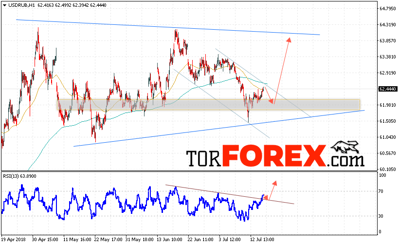 Таким образом, USD/RUB прогноз курса Доллара на 18 июля 2018 предполагает попытку теста уровня поддержки вблизи области 62.05, откуда стоит ожидать отскок и попытку продолжения роста курса Доллара против Рубля с целью выше уровня 63.85, дополнительным сигналом в пользу роста пары выступит тест линии тренда на индикаторе относительной силы, отменой варианта роста станет пробой нижней границы модели «Треугольник» и закрытие котировок ниже уровня 61.50.
