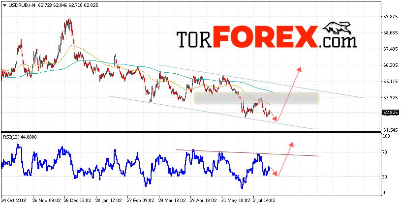 В пользу роста пары USD/RUB 18 июля 2019 выступит тест линии поддержки на индикаторе относительной силы. Вторым сигналом станет отскок от нижней границы нисходящего канала. Отменой варианта роста пары USD/RUB на Форекс станет падение и пробой уровня 61.05 Рублей за Доллар. Это укажет на пробой области поддержки и продолжение снижения пары Доллар Рубль в область ниже уровня 58.65. Подтверждением роста пары выступит пробой области сопротивления и закрытие над уровнем 63.95, что укажет на завершение формирования разворотной модели «Двойное Дно».