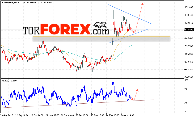 В пользу роста пары USD/RUB выступит тест линии поддержки на индикаторе относительной силы. Отменой варианта роста пары USD/RUB на Форекс станет падение и пробой уровня 60.40 Рублей за Доллар, что укажет на пробой нижней границы модели «Треугольник» и продолжение падения пары Доллар Рубль в область ниже уровня 59.00. Подтверждением роста пары выступит пробой верхней границы модели и закрытие выше уровня 63.90.
