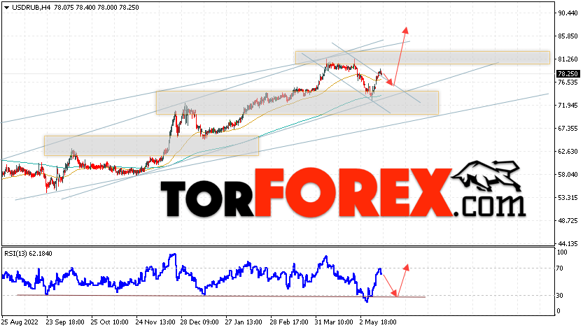 Дополнительным сигналом в пользу подъёма валютной пары USD/RUB 18 мая 2023 выступит тест линии тренда на индикаторе относительной силы. Вторым сигналом станет отскок от нижней границы бычьего канала. Отменой варианта роста пары USD/RUB на Форекс станет падение котировок и пробой уровня 71.65 Рублей за Доллар. Это укажет на пробой области поддержки и продолжение падения пары Доллар Рубль в область ниже уровня 65.45. Подтверждением росту пары выступит пробой области сопротивления и закрытие котировок актива над уровнем 79.65.