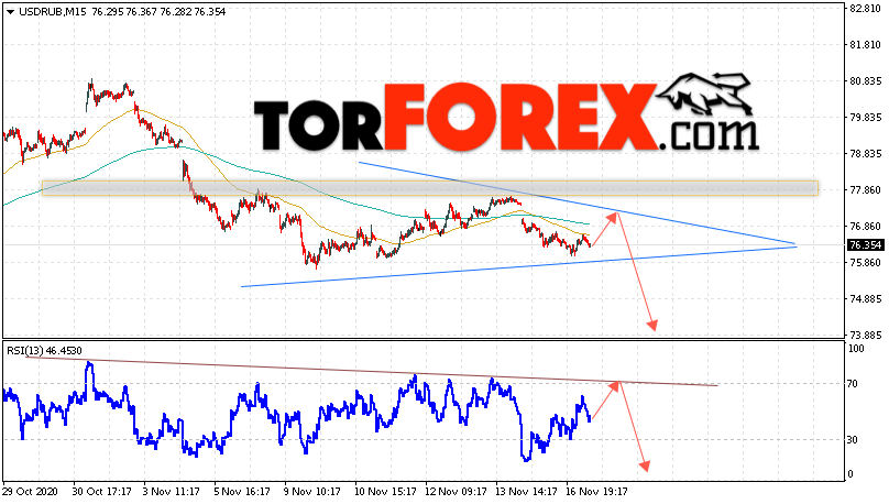 Дополнительным сигналом в пользу падения валютной пары USD/RUB 18 ноября 2020 выступит тест линии сопротивления на индикаторе относительной силы. Вторым сигналом станет отскок от верхней границы нисходящего канала. Отменой варианта падения пары USD/RUB на Форекс станет сильный рост и пробой уровня 78.55. Рублей за Доллар. Это укажет на пробой области сопротивления и продолжение роста пары Доллар Рубль в область выше уровня 81.45. Подтверждением падения пары выступит пробой области поддержки и закрытие котировок актива под уровнем 74.95, что укажет на пробой нижней границы модели ”Треугольник”.