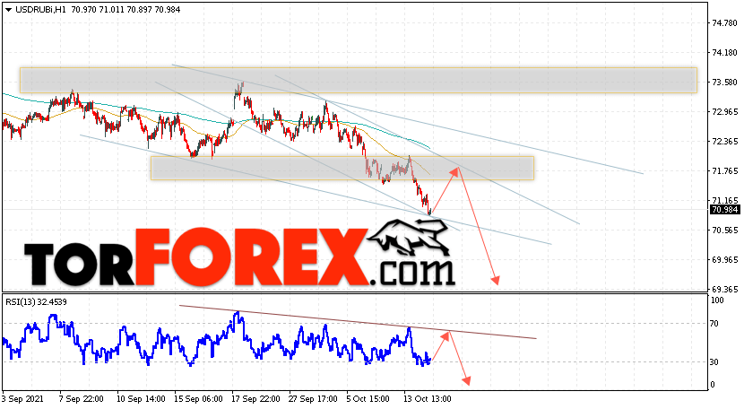 Валютная пара Доллар Рубль USD/RUB продолжает движение в рамках падения и нисходящего канала. В момент публикации прогноза курс Доллара США к Российскому Рублю составляет 70.98. Скользящие средние указывают на наличие краткосрочной медвежьей тенденции. Цены ушли вниз от области между сигнальными линиями, что указывает на давление со стороны продавцов американской валюты и потенциальное продолжение падения Доллара США против Российского Рубля. В рамках прогноза курса Доллара на 18 октября 2021 стоит ожидать попытку развития роста цены и тест уровня сопротивления вблизи области 71.75 Рублей за Доллар США. Затем, отскок вниз и продолжение падения валютной пары в область ниже уровня 69.35.
