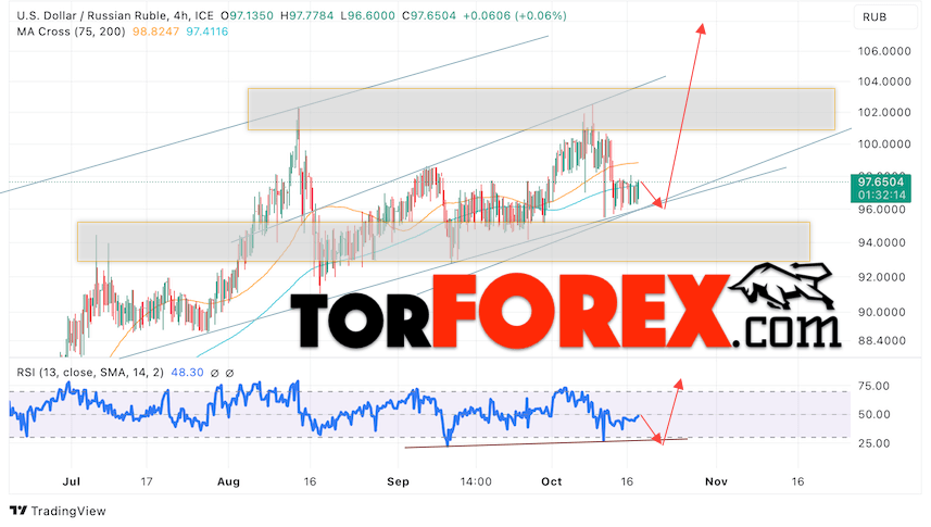 Дополнительным сигналом в пользу подъёма валютной пары USD/RUB 18 октября 2023 выступит тест линии тренда на индикаторе относительной силы. Вторым сигналом станет отскок от нижней границы бычьего канала. Отменой варианта роста пары USD/RUB на Форекс станет падение котировок и пробой уровня 93.55 Рублей за Доллар. Это укажет на пробой области поддержки и продолжение падения пары Доллар Рубль в область ниже уровня 87.05. Подтверждением росту пары выступит пробой области сопротивления и закрытие котировок актива над уровнем 100.05.