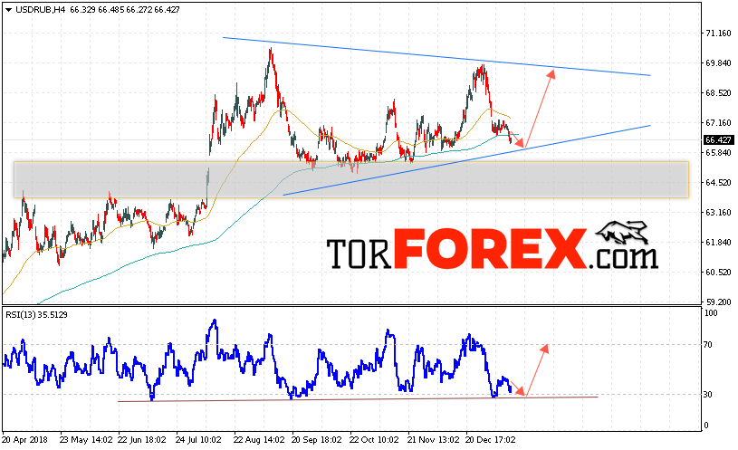 Таким образом, USD/RUB прогноз курса Доллара на 18 января 2019 предполагает попытку теста уровня поддержки вблизи области 66.00. Откуда стоит ожидать отскок и продолжения роста курса Доллара против Рубля с целью выше уровня 69.75. Дополнительным сигналом в пользу роста пары выступит тест линии поддержки на индикаторе относительной силы. Отменой варианта роста станет пробой нижней границы канала и закрытие котировок ниже уровня 65.70.