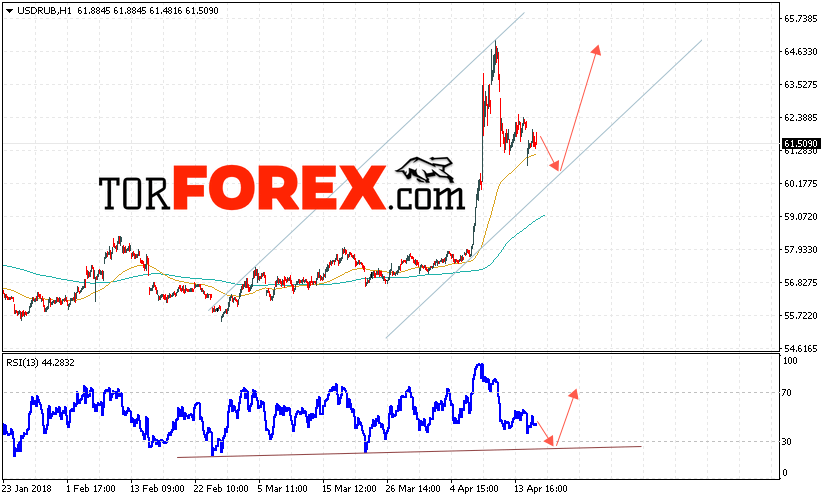 Таким образом, USD/RUB прогноз курса Доллара на 19 апреля 2018 предполагает попытку теста уровня поддержки вблизи области 60.50, откуда стоит ожидать отскок и попытку продолжения роста курса Доллара против Рубля с целью выше уровня 65.00, дополнительным сигналом в пользу роста пары выступит тест линии тренда на индикаторе относительной силы.