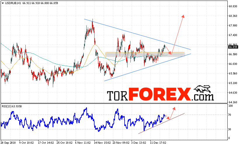 Таким образом, USD/RUB прогноз курса Доллара на 19 декабря 2018 предполагает попытку теста уровня поддержки вблизи области 66.65. Откуда стоит ожидать отскок и продолжения роста курса Доллара против Рубля с целью выше уровня 68.35. Дополнительным сигналом в пользу роста пары выступит тест линии тренда на индикаторе относительной силы. Отменой варианта подъёма станет пробой области поддержки и закрытие котировок ниже уровня 66.00.