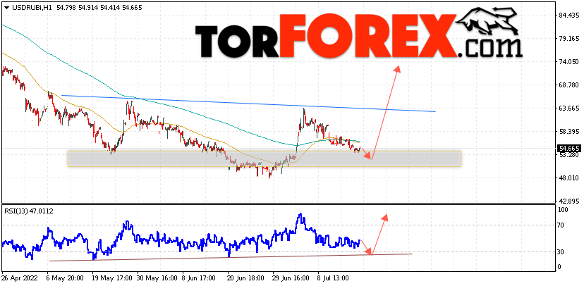 Дополнительным сигналом в пользу роста валютной пары USD/RUB 19 июля 2022 выступит тест линии тренда на индикаторе относительной силы. Вторым сигналом станет отскок от нижней границы разворотной модели перевёрнутая ”Голова и плечи”. Отменой варианта роста пары USD/RUB на Форекс станет падение котировок и пробой уровня 46.45 Рублей за Доллар. Это укажет на пробой области поддержки и продолжение падения пары Доллар Рубль в область ниже уровня 40.75. Подтверждением росту пары выступит пробой области сопротивления и закрытие котировок актива над уровнем 64.55, что укажет на пробой линии ”Шеи” разворотной модели ”Голова и плечи” и начало отработки паттерна с целями вверху.