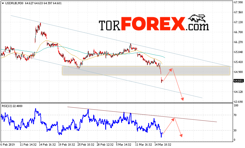 Таким образом, USD/RUB прогноз курса Доллара на 19 марта 2019 предполагает попытку теста уровня поддержки вблизи области 65.05. Откуда стоит ожидать отскок и продолжения падения курса Доллара против Рубля с целью ниже уровня 63.70. Дополнительным сигналом в пользу снижения пары выступит тест области сопротивления на индикаторе относительной силы. Отменой варианта падения станет пробой области сопротивления и закрытие котировок выше уровня 67.15.