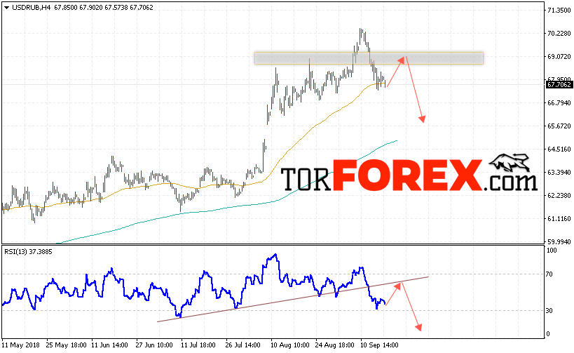 В пользу снижения пары USD/RUB выступит тест линии тренда на индикаторе относительной силы, а также тест области сопротивления на графике цены. Отменой варианта падения пары USD/RUB на Форекс станет сильный рост и пробой уровня 70.40 Рублей за Доллар, что укажет на пробой области сопротивления и продолжение роста пары Доллар Рубль в область выше уровня 72.50. Подтверждением падения пары выступит пробой области поддержки и закрытие ниже уровня 66.90.