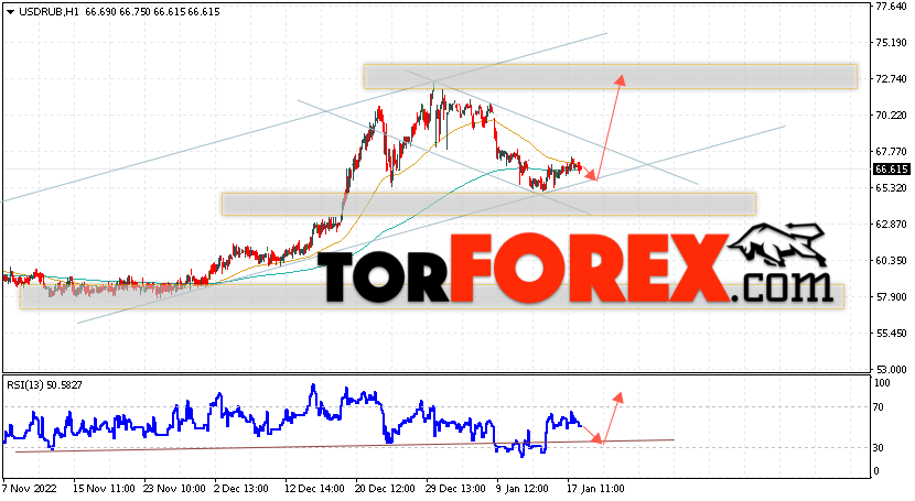 Дополнительным сигналом в пользу подъёма валютной пары USD/RUB 19 января 2023 выступит тест бычьей линии тренда на индикаторе относительной силы. Вторым сигналом станет отскок от нижней границы бычьего канала. Отменой варианта роста пары USD/RUB на Форекс станет падение котировок и пробой уровня 63.35 Рублей за Доллар. Это укажет на пробой области поддержки и продолжение падения пары Доллар Рубль в область ниже уровня 57.65. Подтверждением росту пары выступит пробой области сопротивления и закрытие котировок актива над уровнем 69.85, что укажет на пробой верхней границы нисходящего канала коррекции.