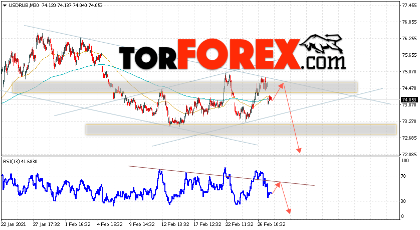 Дополнительным сигналом в пользу падения валютной пары USD/RUB 2 марта 2021 выступит тест линии сопротивления на индикаторе относительной силы. Вторым сигналом станет отскок от верхней границы нисходящего канала. Отменой варианта падения пары USD/RUB на Форекс станет сильный рост и пробой уровня 75.55. Рублей за Доллар. Это укажет на пробой области сопротивления и продолжение роста пары Доллар Рубль в область выше уровня 78.35. Подтверждением падения пары выступит пробой области поддержки и закрытие котировок актива под уровнем 72.95.