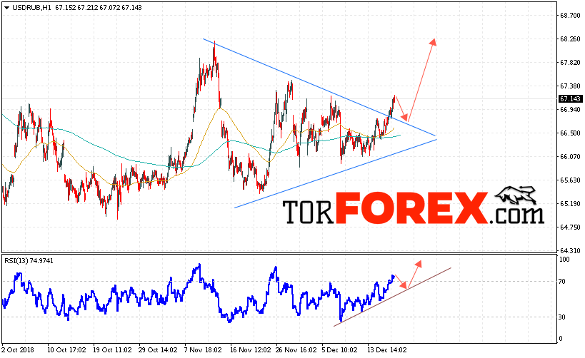 В пользу роста пары USD/RUB выступит тест линии тренда на индикаторе относительной силы. А также отскок от верхней границы модели «Треугольник». Отменой варианта роста пары USD/RUB на Форекс станет падение и пробой уровня 66.00 Рублей за Доллар. Это укажет на области поддержки и продолжение снижения пары Доллар Рубль в область ниже уровня 65.00. Подтверждением роста пары выступит пробой области сопротивления и закрытие выше уровня 67.35.