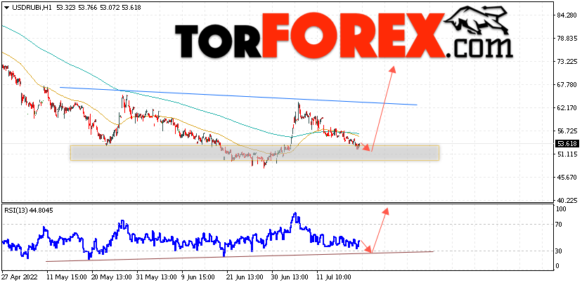 Дополнительным сигналом в пользу роста валютной пары USD/RUB 20 июля 2022 выступит тест линии тренда на индикаторе относительной силы. Вторым сигналом станет отскок от нижней границы разворотной модели перевёрнутая ”Голова и плечи”. Отменой варианта роста пары USD/RUB на Форекс станет падение котировок и пробой уровня 46.55 Рублей за Доллар. Это укажет на пробой области поддержки и продолжение падения пары Доллар Рубль в область ниже уровня 40.45. Подтверждением росту пары выступит пробой области сопротивления и закрытие котировок актива над уровнем 64.55, что укажет на пробой линии ”Шеи” разворотной модели ”Голова и плечи” и начало отработки паттерна с целями вверху.