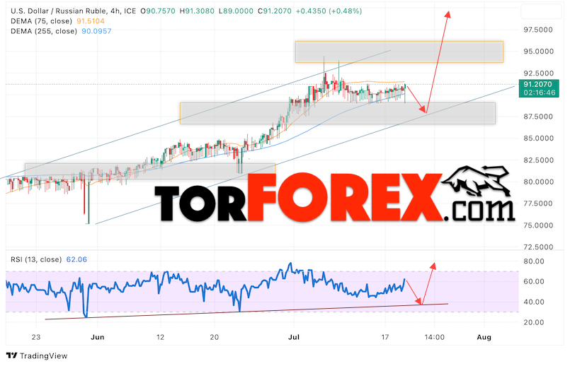 Дополнительным сигналом в пользу подъёма валютной пары USD/RUB 20 июля 2023 выступит тест линии тренда на индикаторе относительной силы. Вторым сигналом станет отскок от нижней границы бычьего канала. Отменой варианта роста пары USD/RUB на Форекс станет падение котировок и пробой уровня 85.25 Рублей за Доллар. Это укажет на пробой области поддержки и продолжение падения пары Доллар Рубль в область ниже уровня 80.65. Подтверждением росту пары выступит пробой области сопротивления и закрытие котировок актива над уровнем 93.45.