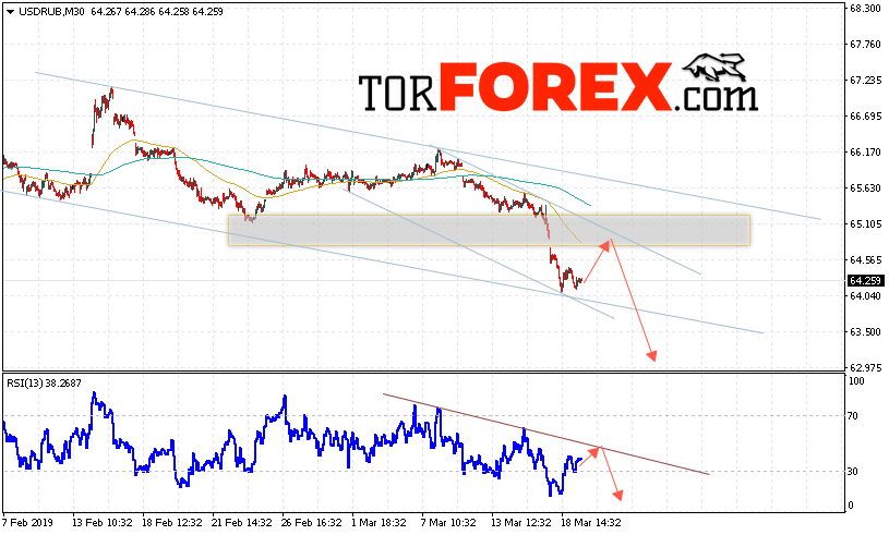 Таким образом, USD/RUB прогноз курса Доллара на 20 марта 2019 предполагает попытку теста уровня поддержки вблизи области 64.75. Откуда стоит ожидать отскок и продолжения падения курса Доллара против Рубля с целью ниже уровня 62.95. Дополнительным сигналом в пользу снижения пары выступит тест области сопротивления на индикаторе относительной силы. Отменой варианта падения станет пробой области сопротивления и закрытие котировок выше уровня 67.05.