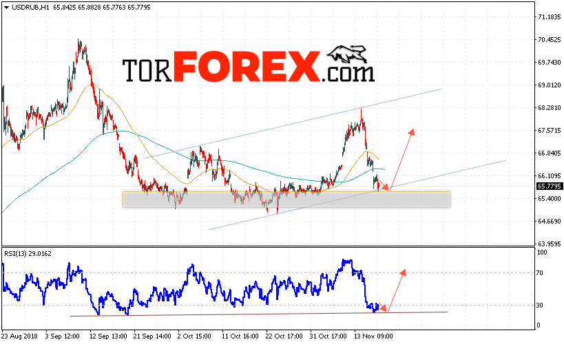 Таким образом, USD/RUB прогноз курса Доллара на 20 ноября 2018 предполагает попытку теста уровня поддержки вблизи области 65.65. Откуда стоит ожидать отскок и продолжения роста курса Доллара против Рубля с целью выше уровня 67.55. Дополнительным сигналом в пользу роста пары выступит тест линии тренда на индикаторе относительной силы. Отменой варианта роста станет пробой области поддержки и закрытие котировок ниже уровня 65.25.
