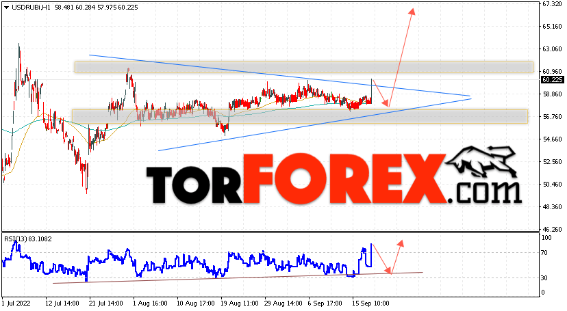 Валютная пара Доллар Рубль USD/RUB продолжает движение в рамках сильного роста и формирования модели ”Треугольник”. В момент публикации прогноза курс Доллара США к Российскому Рублю составляет 60.22. Скользящие средние указывают на наличие краткосрочной бычьей тенденции. Цены пробили область между сигнальными линиями вверх, что указывает на давление со стороны покупателей американской валюты и потенциальное продолжение роста Доллара США против Российского Рубля. В рамках прогноза курса Доллара на 20 сентября 2022 стоит ожидать попытку развития коррекции цены и тест уровня поддержки вблизи области 57.35 Рублей за Доллар США. Затем, отскок вверх и продолжение подъёма валютной пары в область выше уровня 66.05.