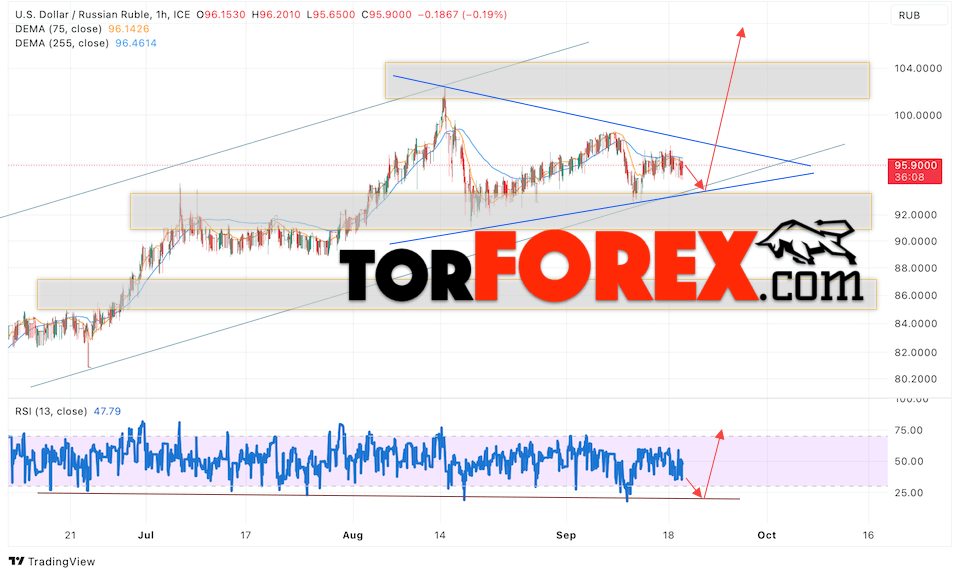 Валютная пара Доллар Рубль USD/RUB продолжает движение в рамках роста и формирования модели «Треугольник». В момент публикации прогноза курс Доллара США к Российскому Рублю составляет 95.90. Скользящие средние указывают на наличие краткосрочной медвежьей тенденции. Цены вновь тестируют область между сигнальными линиями, что указывает на давление со стороны продавцов американской валюты и потенциальное продолжение падения Доллара США против Российского Рубля. В рамках прогноза курса Доллара на 20 сентября 2023 стоит ожидать попытку развития коррекции цены и тест уровня поддержки вблизи области 94.05 Рублей за Доллар США. Затем, отскок вверх и продолжение роста валютной пары в область выше уровня 106.85.