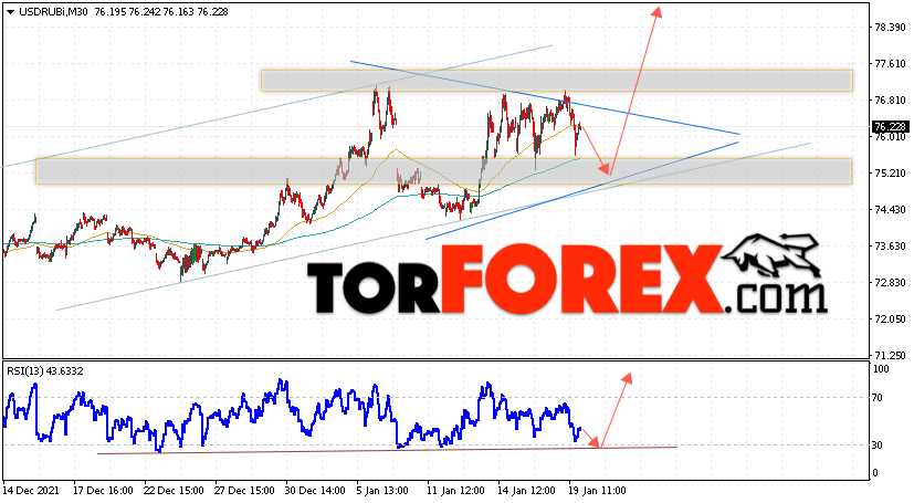 Дополнительным сигналом в пользу роста валютной пары USD/RUB 20 января 2022 выступит тест линии тренда на индикаторе относительной силы. Вторым сигналом станет отскок от нижней границы разворотной модели ”Треугольник”. Отменой варианта роста пары USD/RUB на Форекс станет падение котировок и пробой уровня 74.45 Рублей за Доллар. Это укажет на пробой области поддержки и продолжение падения пары Доллар Рубль в область ниже уровня 72.65. Подтверждением подъёма пары выступит пробой области сопротивления и закрытие котировок актива над уровнем 77.65, что укажет на пробой верхней границы модели ”Треугольник”.