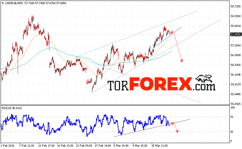 Таким образом, USD/RUB прогноз курса Доллара на 20 марта 2018 предполагает попытку теста уровня сопротивления вблизи области 57.70, откуда стоит ожидать отскок и попытку продолжения падения курса Доллара против Рубля с целью ниже уровня 56.50, дополнительным сигналом в пользу падения пары выступит тест линии тренда на индикаторе относительной силы.