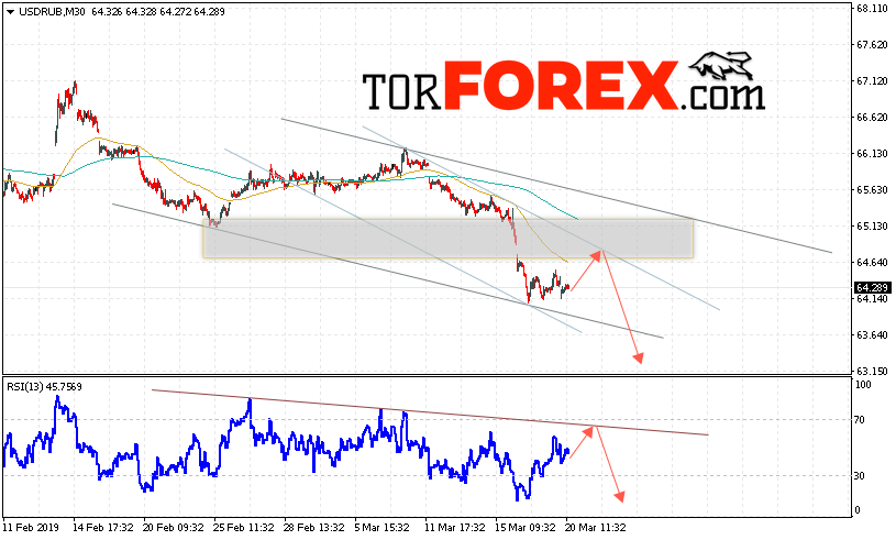 Таким образом, USD/RUB прогноз курса Доллара на 21 марта 2019 предполагает попытку теста уровня поддержки вблизи области 64.65. Откуда стоит ожидать отскок и продолжения падения курса Доллара против Рубля с целью ниже уровня 63.15. Дополнительным сигналом в пользу снижения пары выступит тест области сопротивления на индикаторе относительной силы. Отменой варианта падения станет пробой области сопротивления и закрытие котировок выше уровня 64.85.