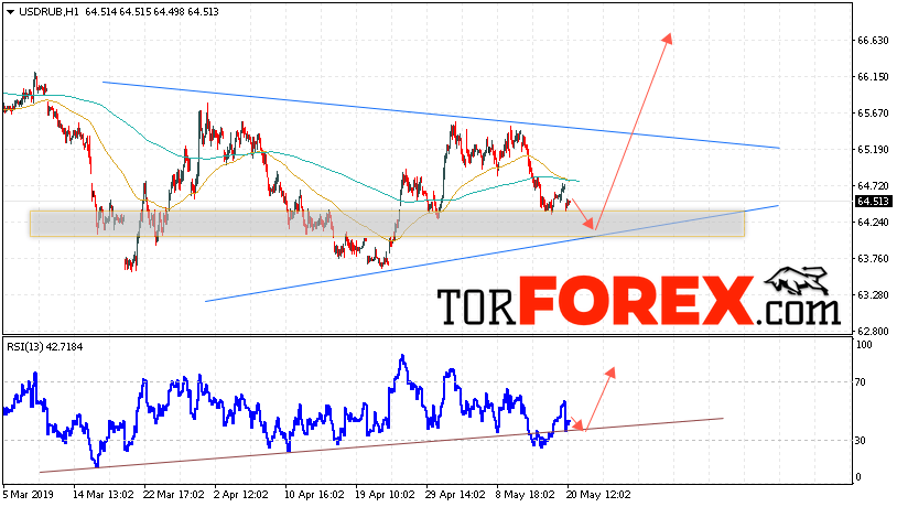 В пользу подъёма пары USD/RUB 21 мая 2019 выступит тест линии поддержки на индикаторе относительной силы (RSI). Вторым сигнальном станет отскок от нижней границы модели «Треугольник». Отменой варианта подъёма пары USD/RUB на Форекс станет падение и пробой уровня 63.30 Рублей за Доллар. Это укажет на пробой области поддержки и продолжение снижения пары Доллар Рубль в область ниже уровня 62.15. Подтверждением роста пары выступит пробой области сопротивления и закрытие выше уровня 65.65.
