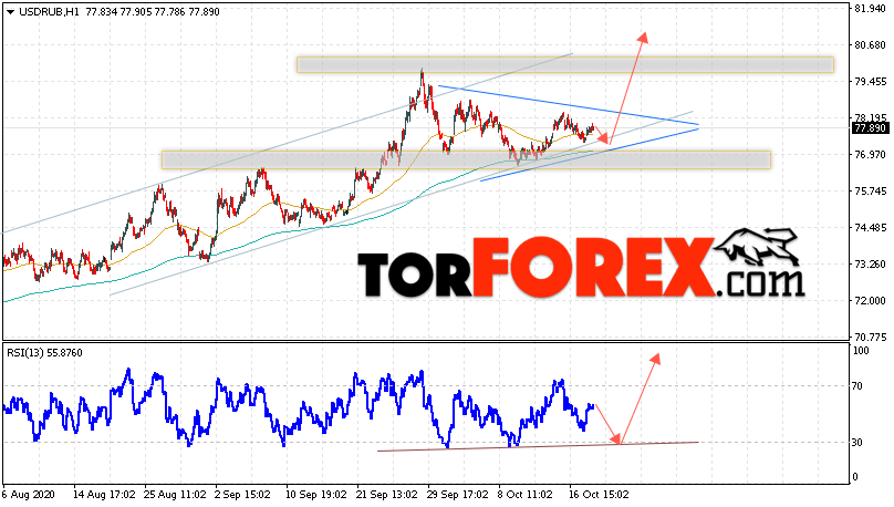Валютная пара Доллар Рубль USD/RUB продолжает движение в рамках роста и восходящего канала. Здесь же формируется модель ”Треугольник”. В момент публикации прогноза курс Доллара США к Российскому Рублю составляет 77.89. Скользящие средние указывают на наличие краткосрочной бычьей тенденции. Цены вновь тестируют область между сигнальными линиями, что указывает на давление со стороны покупателей американской валюты и потенциальное продолжение роста Доллара США против Российского Рубля. В рамках прогноза курса Доллара на 21 октября 2020 стоит ожидать попытку развития коррекции и тест уровня поддержки вблизи области 77.05 Рублей за Доллар США. Затем, отскок и продолжение роста валютной пары в область выше уровня 80.75.