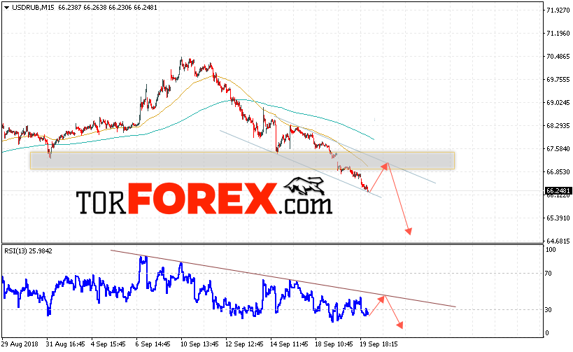В пользу снижения пары USD/RUB выступит тест линии тренда на индикаторе относительной силы. Отменой варианта падения пары USD/RUB на Форекс станет сильный рост и пробой уровня 67.60 Рублей за Доллар, что укажет на пробой области сопротивления и продолжение роста пары Доллар Рубль в область выше уровня 69.50. Подтверждением падения пары выступит пробой области поддержки и закрытие ниже уровня 66.00.