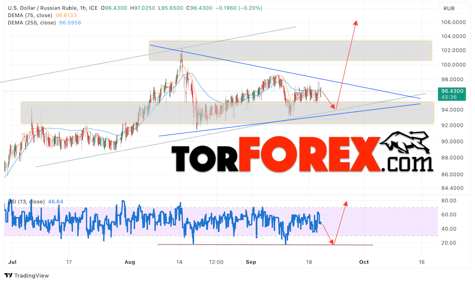 Валютная пара Доллар Рубль USD/RUB продолжает движение в рамках роста и формирования модели «Треугольник». В момент публикации прогноза курс Доллара США к Российскому Рублю составляет 96.43. Скользящие средние указывают на наличие краткосрочной медвежьей тенденции. Цены вновь тестируют область между сигнальными линиями, что указывает на давление со стороны продавцов американской валюты и потенциальное продолжение падения Доллара США против Российского Рубля. В рамках прогноза курса Доллара на 21 сентября 2023 стоит ожидать попытку развития коррекции цены и тест уровня поддержки вблизи области 94.15 Рублей за Доллар США. Затем, отскок вверх и продолжение роста валютной пары в область выше уровня 106.05.