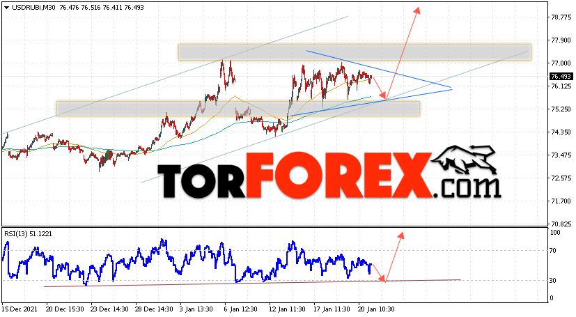 Дополнительным сигналом в пользу роста валютной пары USD/RUB 21 января 2022 выступит тест линии тренда на индикаторе относительной силы. Вторым сигналом станет отскок от нижней границы разворотной модели ”Треугольник”. Отменой варианта роста пары USD/RUB на Форекс станет падение котировок и пробой уровня 74.65 Рублей за Доллар. Это укажет на пробой области поддержки и продолжение падения пары Доллар Рубль в область ниже уровня 72.55. Подтверждением подъёма пары выступит пробой области сопротивления и закрытие котировок актива над уровнем 77.45, что укажет на пробой верхней границы модели ”Треугольник” и начало отработки этого паттерна.