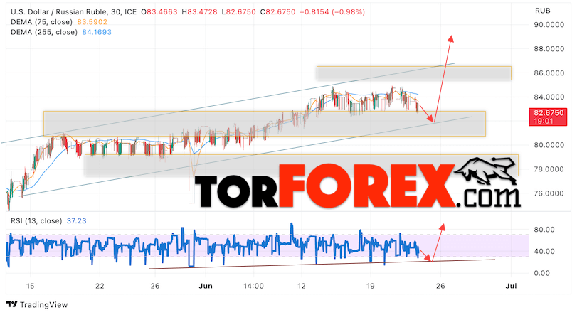 Дополнительным сигналом в пользу подъёма валютной пары USD/RUB 22 июня 2023 выступит тест линии тренда на индикаторе относительной силы. Вторым сигналом станет отскок от нижней границы бычьего канала. Отменой варианта роста пары USD/RUB на Форекс станет падение котировок и пробой уровня 81.35 Рублей за Доллар. Это укажет на пробой области поддержки и продолжение падения пары Доллар Рубль в область ниже уровня 75.45. Подтверждением росту пары выступит пробой области сопротивления и закрытие котировок актива над уровнем 87.65, что укажет на пробой верхней границы бычьего канала, а это сигнал к росту на ширину канала.