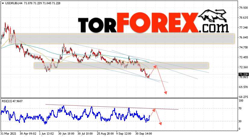 Дополнительным сигналом в пользу падения валютной пары USD/RUB 22 октября 2021 выступит тест медвежьей линии тренда на индикаторе относительной силы. Вторым сигналом станет отскок от верхней границы нисходящего канала. Отменой варианта падения пары USD/RUB на Форекс станет сильный рост и пробой уровня 73.55. Рублей за Доллар. Это укажет на пробой области сопротивления и продолжение подъёма пары Доллар Рубль в область выше уровня 76.25. Подтверждением падения пары выступит пробой области поддержки и закрытие котировок актива под уровнем 70.05.