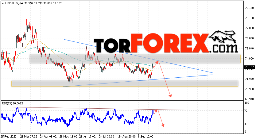Дополнительным сигналом в пользу падения валютной пары USD/RUB 22 сентября 2021 выступит тест линии тренда на индикаторе относительной силы. Вторым сигналом станет отскок от верхней границы модели ”Треугольник”. Отменой варианта падения пары USD/RUB на Форекс станет сильный рост и пробой уровня 74.65. Рублей за Доллар. Это укажет на пробой области сопротивления и продолжение подъёма пары Доллар Рубль в область выше уровня 76.85. Подтверждением падения пары выступит пробой области поддержки и закрытие котировок актива под уровнем 71.55, что укажет на пробой нижней границы модели ”Треугольник”.