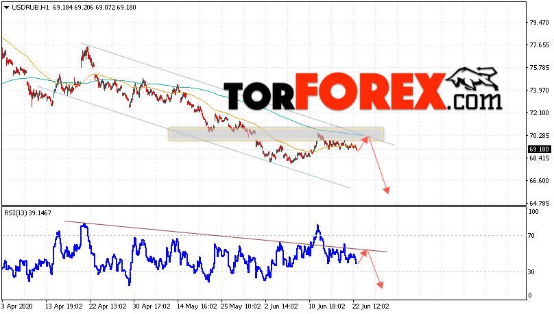 Дополнительным сигналом в пользу падения валютной пары USD/RUB 23 июня 2020 выступит тест линии сопротивления на индикаторе относительной силы. Вторым сигналом станет отскок от верхней границы нисходящего канала. Отменой варианта падения пары USD/RUB на Форекс станет сильный рост и пробой уровня 71.25. Рублей за Доллар. Это укажет на пробой области сопротивления и продолжение подъёма пары Доллар Рубль в область выше уровня 73.75. Подтверждением падения пары выступит пробой области поддержки и закрытие под уровнем 67.65.