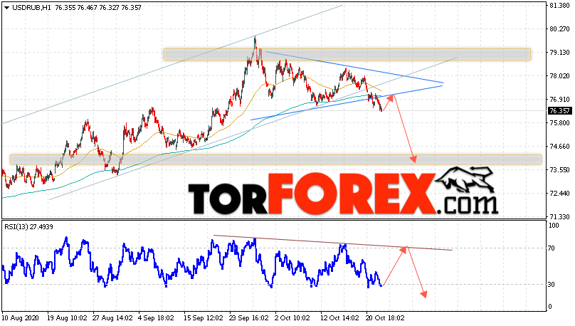 Дополнительным сигналом в пользу падения валютной пары USD/RUB 23 октября 2020 выступит тест линии сопротивления на индикаторе относительной силы. Вторым сигналом станет отскок от нижней границы модели ”Треугольник”. Отменой варианта падения пары USD/RUB на Форекс станет сильный рост и пробой уровня 78.15. Рублей за Доллар. Это укажет на пробой области сопротивления и продолжение роста пары Доллар Рубль в область выше уровня 81.65. Подтверждением падения пары выступит пробой области поддержки и закрытие котировок актива под уровнем 76.25.