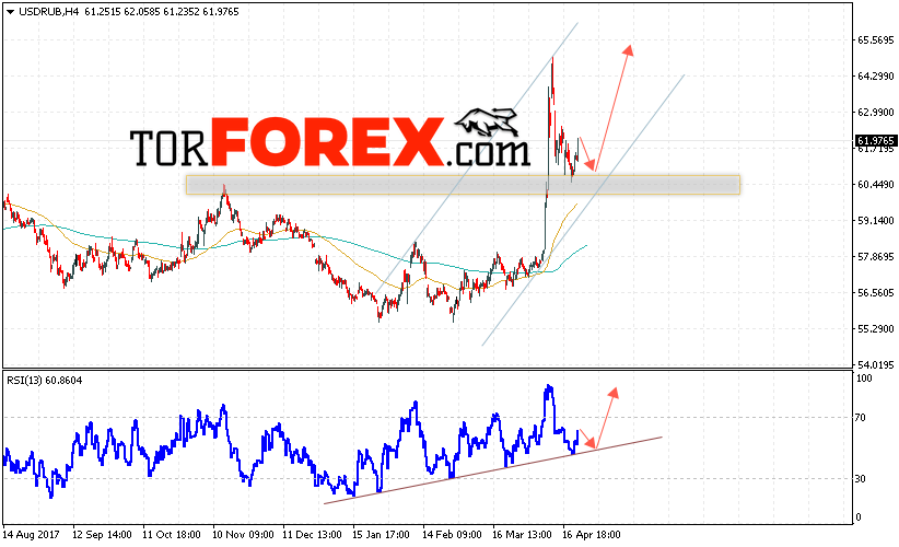 Таким образом, USD/RUB прогноз курса Доллара на 24 апреля 2018 предполагает попытку теста уровня поддержки вблизи области 61.00, откуда стоит ожидать отскок и попытку продолжения роста курса Доллара против Рубля с целью выше уровня 65.50, дополнительным сигналом в пользу роста пары выступит тест линии тренда на индикаторе относительной силы.