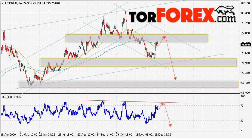 Дополнительным сигналом в пользу снижения валютной пары USD/RUB 24 декабря 2020 выступит тест линии сопротивления на индикаторе относительной силы. Вторым сигналом станет отскок от верхней границы нисходящего канала. Отменой варианта падения пары USD/RUB на Форекс станет сильный рост и пробой уровня 77.95. Рублей за Доллар. Это укажет на пробой области сопротивления и продолжение подъёма пары Доллар Рубль в область выше уровня 79.85. Подтверждением падения пары выступит пробой области поддержки и закрытие котировок актива под уровнем 71.25.