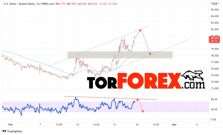 Дополнительным сигналом в пользу падения валютной пары USD/RUB 24 февраля 2022 выступит тест линии тренда на индикаторе относительной силы. Вторым сигналом станет отскок от верхней границы бычьего канала. Отменой варианта падения пары USD/RUB на Форекс станет сильный рост котировок и пробой уровня 82.75 Рублей за Доллар. Это укажет на пробой области сопротивления и продолжение роста пары Доллар Рубль в область выше уровня 85.65. Подтверждением падения пары выступит пробой области поддержки и закрытие котировок актива под уровнем 79.05.