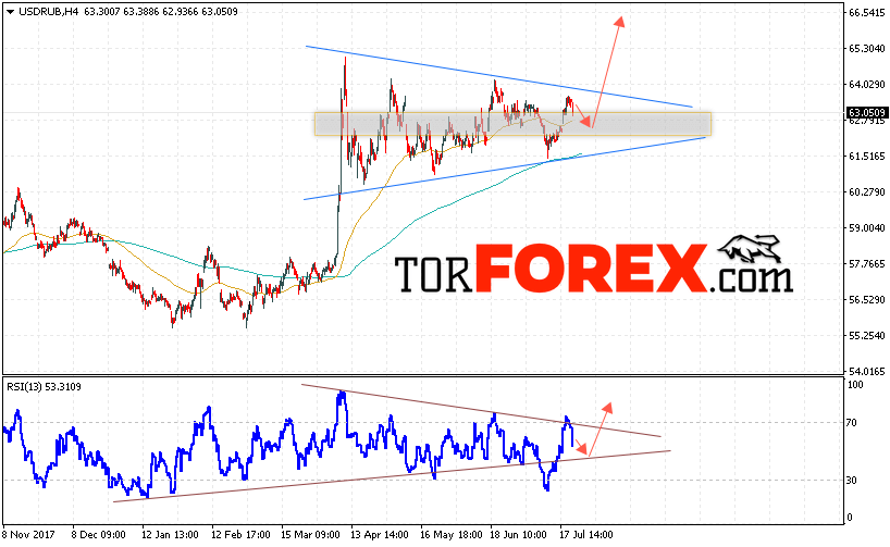 В пользу роста пары USD/RUB выступит тест линии тренда на индикаторе относительной силы. Отменой варианта роста пары USD/RUB на Форекс станет падение и пробой уровня 61.20 Рублей за Доллар, что укажет на пробой нижней границы модели «Треугольник» и продолжение падения пары Доллар Рубль в область ниже уровня 60.00. Подтверждением роста пары выступит пробой верхней границы модели «Треугольник» и закрытие выше уровня 64.10.