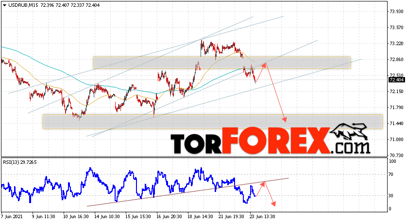 Дополнительным сигналом в пользу падения валютной пары USD/RUB 24 июня 2021 выступит тест линии сопротивления на индикаторе относительной силы. Вторым сигналом станет отскок от нижней границы бычьего канала. Отменой варианта падения пары USD/RUB на Форекс станет сильный рост и пробой уровня 73.65. Рублей за Доллар. Это укажет на пробой области сопротивления и продолжение роста пары Доллар Рубль в область выше уровня 74.55. Подтверждением падения пары выступит пробой области поддержки и закрытие котировок актива под уровнем 72.55.