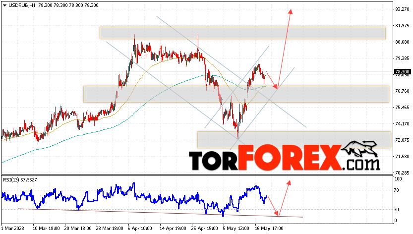 Дополнительным сигналом в пользу подъёма валютной пары USD/RUB 24 мая 2023 выступит тест линии тренда на индикаторе относительной силы. Вторым сигналом станет отскок от нижней границы бычьего канала. Отменой варианта роста пары USD/RUB на Форекс станет падение котировок и пробой уровня 74.35 Рублей за Доллар. Это укажет на пробой области поддержки и продолжение падения пары Доллар Рубль в область ниже уровня 68.75. Подтверждением росту пары выступит пробой области сопротивления и закрытие котировок актива над уровнем 81.25.