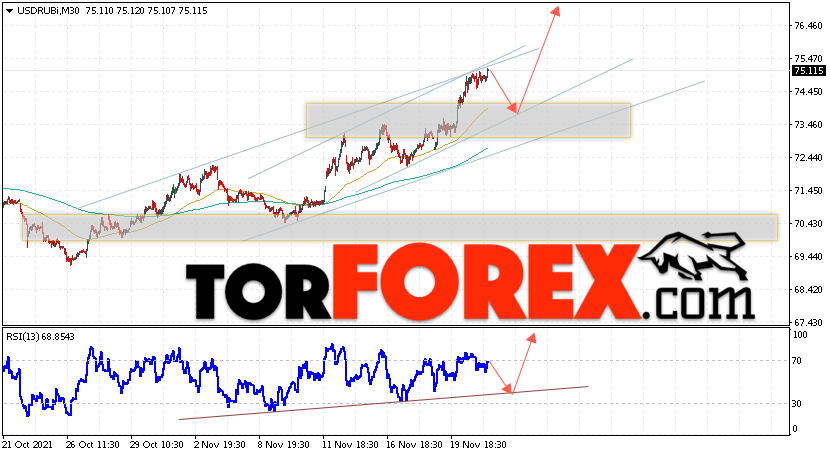 Дополнительным сигналом в пользу подъёма валютной пары USD/RUB 24 ноября 2021 выступит тест бычьей линии тренда на индикаторе относительной силы. Вторым сигналом станет отскок от нижней границы бычьего канала. Отменой варианта роста пары USD/RUB на Форекс станет падение и пробой уровня 72.05 Рублей за Доллар. Это укажет на пробой области поддержки и продолжение падения пары Доллар Рубль в область ниже уровня 69.75. Подтверждением подъёма пары выступит пробой области сопротивления и закрытие котировок актива над уровнем 75.75.