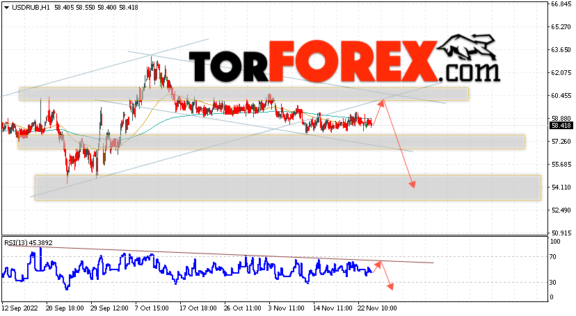 Дополнительным сигналом в пользу падения валютной пары USD/RUB 24 ноября 2022 выступит тест нисходящей линии тренда на индикаторе относительной силы. Вторым сигналом станет отскок от верхней границы нисходящего канала. Отменой варианта падения пары USD/RUB на Форекс станет сильный рост котировок и пробой уровня 62.05 Рублей за Доллар. Это укажет на пробой области сопротивления и продолжение роста пары Доллар Рубль в область выше уровня 63.95. Подтверждением падению пары выступит пробой области поддержки и закрытие котировок актива под уровнем 57.05.