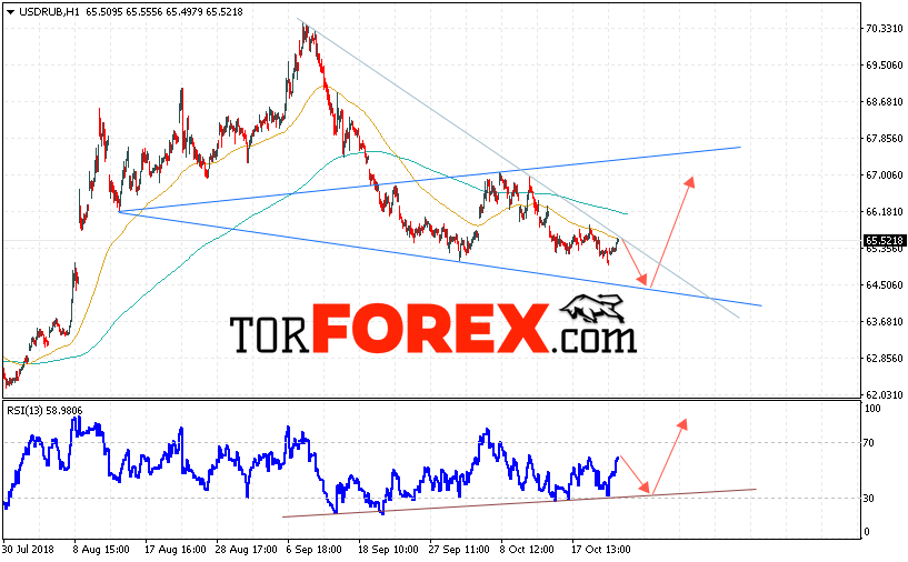 Таким образом, USD/RUB прогноз курса Доллара на 24 октября 2018 предполагает попытку теста уровня поддержки вблизи области 64.50, откуда стоит ожидать отскок и продолжения роста курса Доллара против Рубля с целью выше уровня 67.00, дополнительным сигналом в пользу роста пары выступит тест линии тренда на индикаторе относительной силы, отменой варианта роста станет пробой области поддержки и закрытие котировок ниже уровня 63.50.