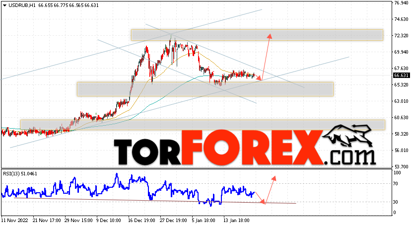 Валютная пара Доллар Рубль USD/RUB продолжает движение в рамках коррекции и бычьего канала. В момент публикации прогноза курс Доллара США к Российскому Рублю составляет 66.63. Скользящие средние указывают на наличие краткосрочной бычьей тенденции. Цены вновь тестируют область между сигнальными линиями, что указывает на давление со стороны продавцов американской валюты и потенциальное продолжение падения Доллара США против Российского Рубля. В рамках прогноза курса Доллара на 24 января 2023 стоит ожидать попытку развития коррекции цены и тест уровня поддержки вблизи области 65.65 Рублей за Доллар США. Затем, отскок вверх и продолжение роста валютной пары в область выше уровня 72.55.