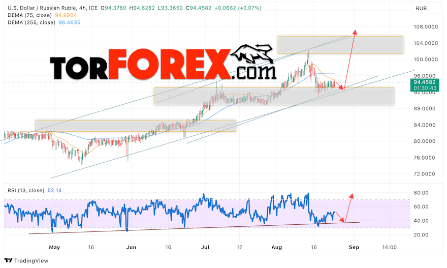 Валютная пара Доллар Рубль USD/RUB продолжает движение в рамках коррекции и бычьего канала. В момент публикации прогноза курс Доллара США к Российскому Рублю составляет 94.45. Скользящие средние указывают на наличие краткосрочной медвежьей тенденции. Цены пробили область между сигнальными линиями вниз, что указывает на давление со стороны продавцов американской валюты и потенциальное продолжение падения Доллара США против Российского Рубля. В рамках прогноза курса Доллара на 25 августа 2023 стоит ожидать попытку развития коррекции цены и тест уровня поддержки вблизи области 92.65 Рублей за Доллар США. Затем, отскок вверх и продолжение роста валютной пары в область выше уровня 105.25.