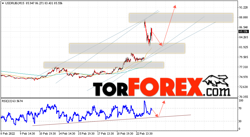 Дополнительным сигналом в пользу роста валютной пары USD/RUB 25 февраля 2022 выступит тест линии тренда на индикаторе относительной силы. Вторым сигналом станет отскок от нижней границы бычьего канала. Отменой варианта роста пары USD/RUB на Форекс станет падение котировок и пробой уровня 79.25 Рублей за Доллар. Это укажет на пробой области поддержки и продолжение падения пары Доллар Рубль в область ниже уровня 75.25. Подтверждением подъёма пары выступит пробой области сопротивления и закрытие котировок актива над уровнем 87.25.