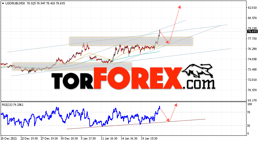 Дополнительным сигналом в пользу роста валютной пары USD/RUB 25 января 2022 выступит тест линии тренда на индикаторе относительной силы. Вторым сигналом станет отскок от нижней границы бычьего канала. Отменой варианта роста пары USD/RUB на Форекс станет падение котировок и пробой уровня 75.05 Рублей за Доллар. Это укажет на пробой области поддержки и продолжение падения пары Доллар Рубль в область ниже уровня 73.75. Подтверждением подъёма пары выступит пробой области сопротивления и закрытие котировок актива над уровнем 79.45, что укажет на пробой верхней границы бычьего канала.